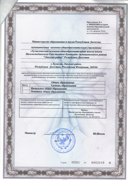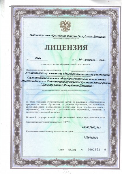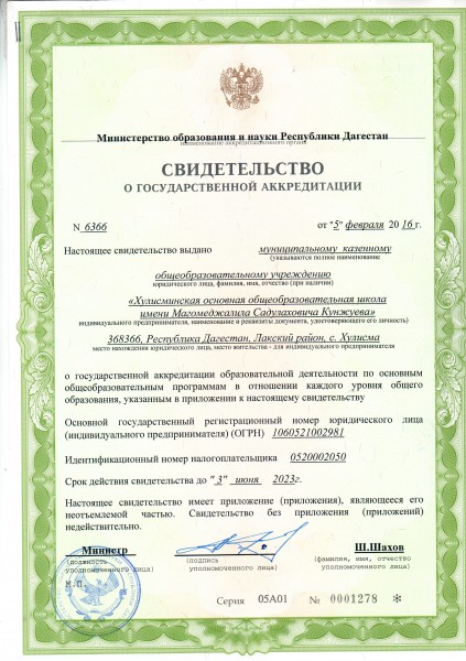 | Полное наименование образовательной организации* | Муниципальное казенное образовательное учреждение "Хулисминская основная общеобразовательная школа имени Магомеджалила Садулаховича Кунжуева" |