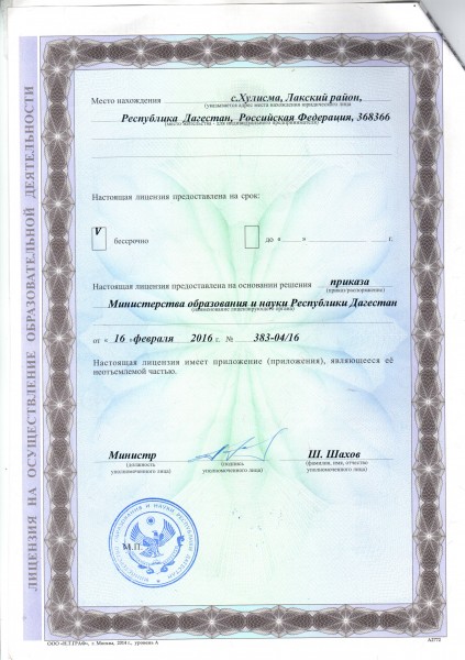 | Адрес местонахождения образовательной организации* | 368366 с.Хулисма, Лакский район. Республика Дагестан РФ. |
